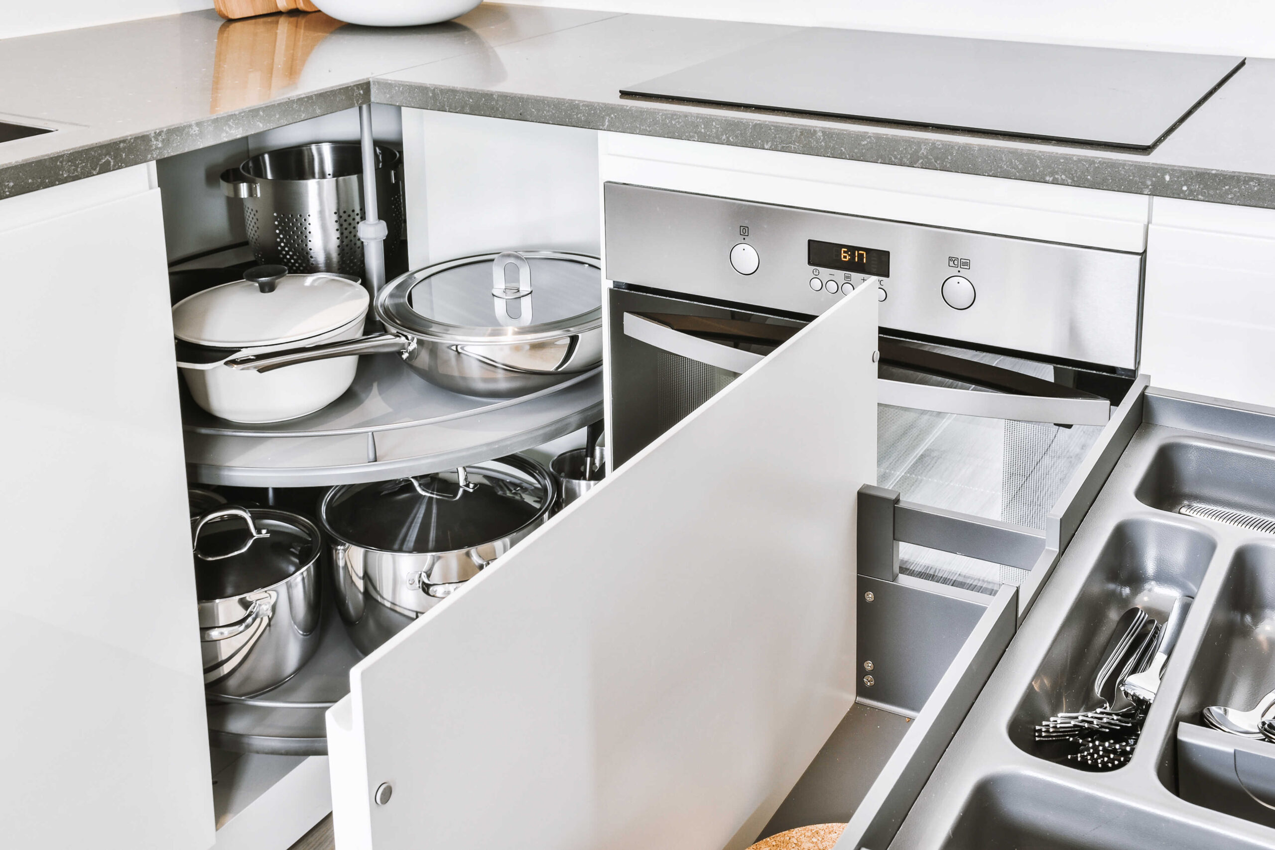 Otevírání rohových skříněk, to je rébus, který ale designéři již dávno vyřešili díky skládacím dvířkům. Ty mají nejen panty upevněné k jedné stěně skříňky, ale také panty spojující obě desky dvířek a umožní tak jejich složení do rohu. Rohové skříňky bývají špatně přístupné, ale s otočným nebo výsuvným systémem je to hračka. Otočné police nebo „ledvinky“ vyjedou při otevření skříňky směrem ven, takže máte okamžitý přístup ke všem hrncům a pánvím. Už žádné složité hrabání v hlubokých skříňkách – všechny věci jsou pěkně na dosah ruky.