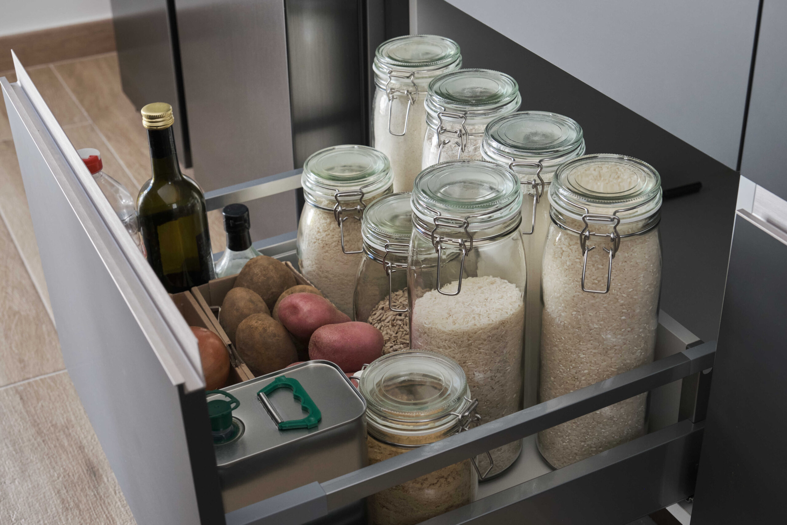 Speciální výsuvné držáky na hrnce a pokličky umožňují uložit nádobí přehledně nad sebou a šetří místo. Výhodou je, že pokličky mají samostatná držátka, takže si uvolníte prostor v zásuvkách a hrnce mají dost místa, takže je nepoškrábete a nemusíte je „štosovat“ do sebe. Dvířka skříňky se navíc dají vybavit přihrádkami na drobné kuchyňské doplňky, což zvyšuje celkovou kapacitu úložného prostoru.