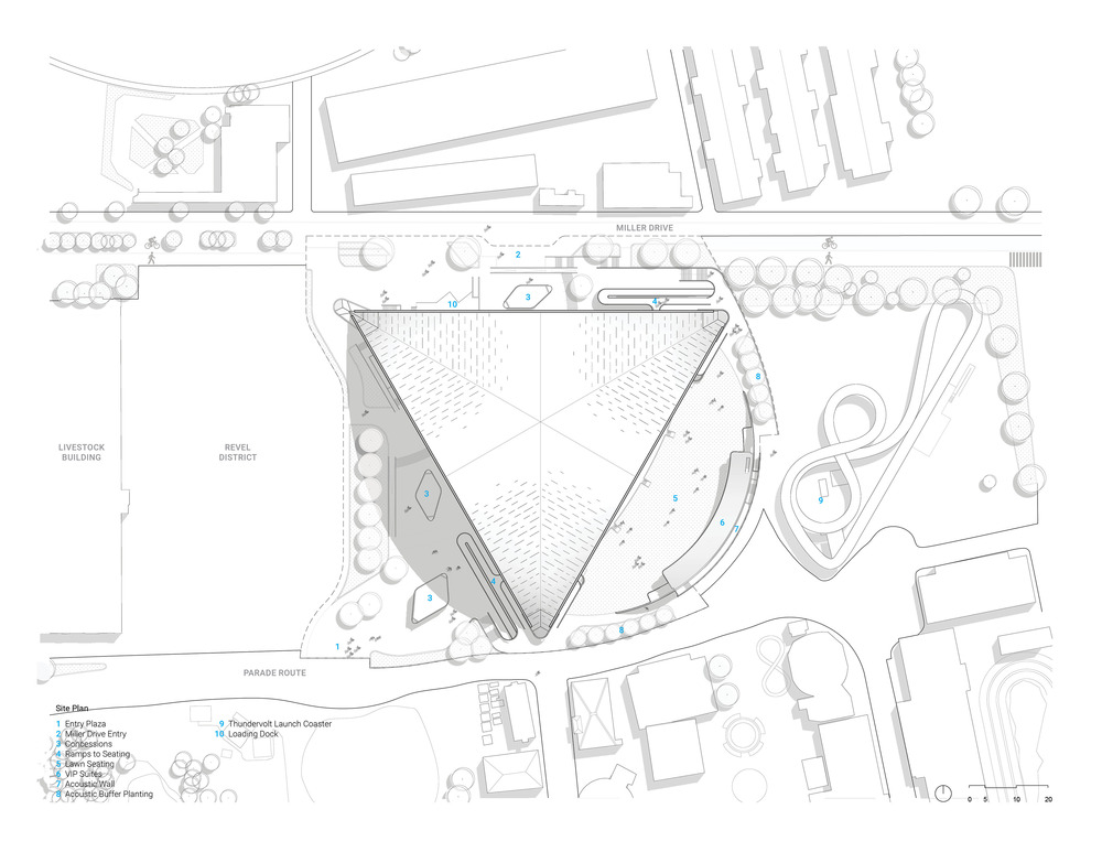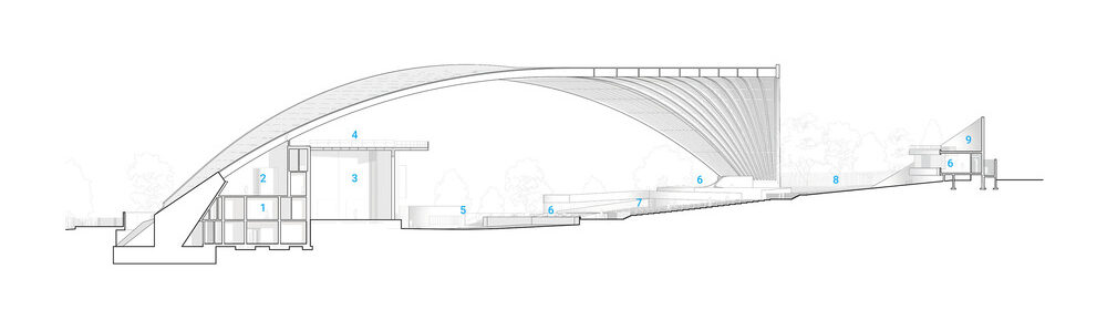 Pod impozantní dřevěnou střechou nebude chybět pódium a v rohu budova zázemí. Na jižní hranici pozemku vyroste sedm metrů vysoká akustická stěna ve tvaru oblouku, která vytvoří bariéru a omezí šíření hluku do okolí. Amfiteátr se totiž nachází v parku obklopeném rezidenčními čtvrtěmi. Právě blízkost obytných budov si vyžádala pečlivý akustický návrh, který zkombinuje optimální zvukový zážitek pro publikum s minimálním narušením okolí.