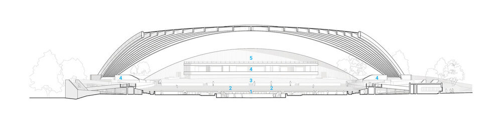 Samonosná dřevěná oblouková střešní konstrukce s hvězdicovou konstrukcí je vůbec první stavbou tohoto typu, která byla realizována z masivního dřeva. Elegantní oblouky využívají lepené lamelové dřevo z douglasky, která má vynikající poměr pevnosti a hmotnosti. Stabilitu konstrukci pak dávají desky z křížem lepených prvků CLT.