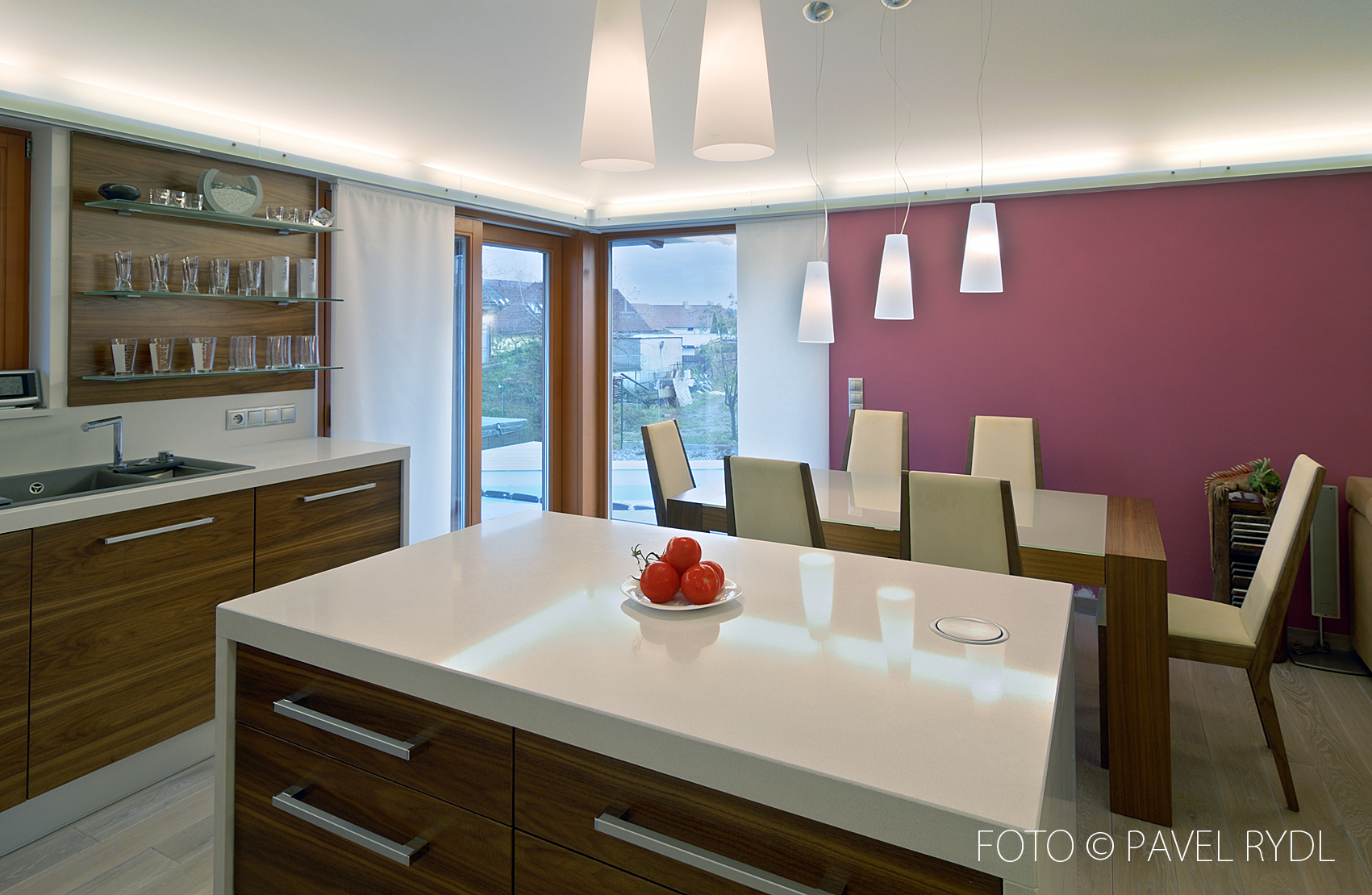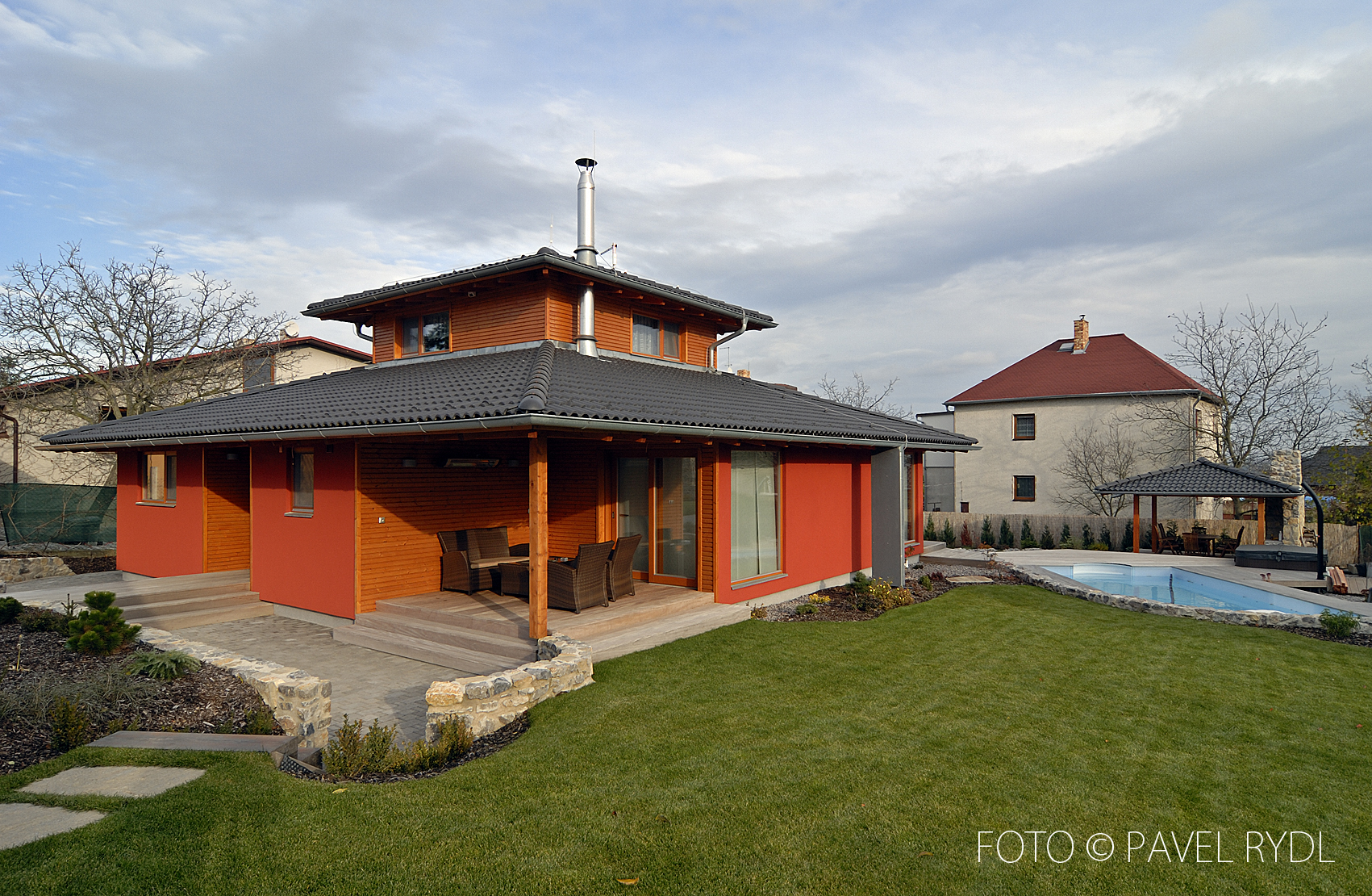 Když se Tůmovi před 17 lety rozhodovali, jaký dům si postaví, inspirovali se tradiční japonskou architekturou. Jejich rodinná firma staví dřevostavby, takže výběr typu domu byl jasný. Cílem bylo vytvořit dům, který by harmonicky zapadl do české krajiny. Výsledkem je nadčasová stavba s krytou terasou, která byla později zasklena a poskytuje pohodlí v každém ročním období.