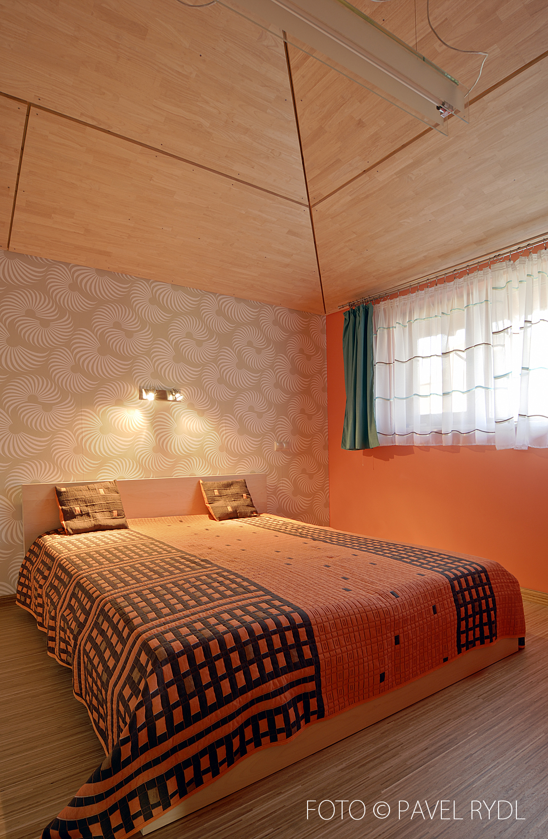Majitel k ladění interiéru dodává: „Pokoje jsme chtěli trochu ozvláštnit a opticky zvětšit, proto jsme kopírovali střechu a použili dřevěné obložení za pomoci spárovky. Zatím co v ložnici, v horním pokoji, jsme pro zvýraznění zvolili protažení dřevěné podlahy na stěnu za postel, proto exotická dřevina, aby to vyniklo.“