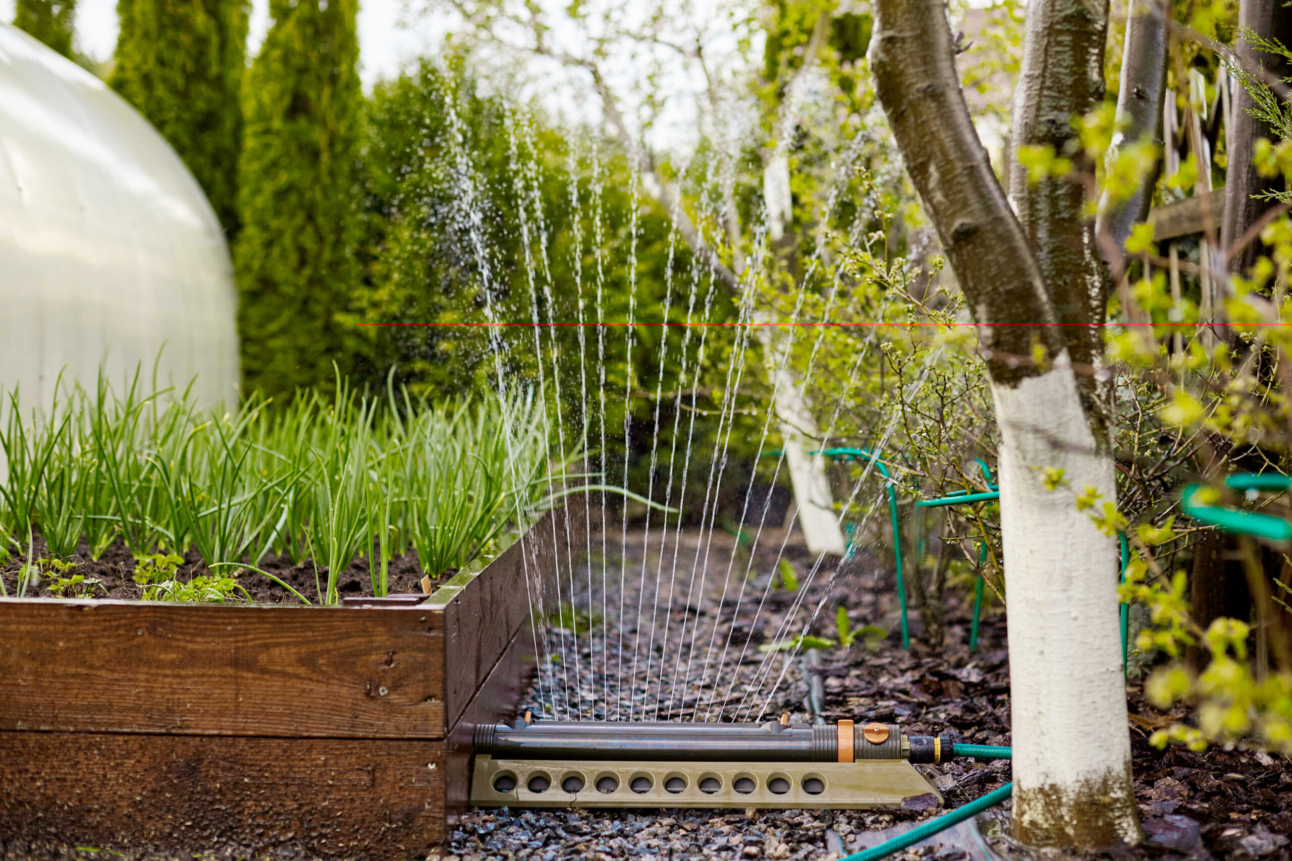 Tyto systémy zavlažují plošně pomocí jemného rozprašování vody nad rostlinami. Hodí se zejména pro trávníky, větší záhony a okrasné výsadby. Mohou být mobilní (např. klasické otočné postřikovače připojené na hadici) nebo zabudované do země s výsuvnými tryskami. Moderní systémy umožňují časování pomocí mechanických nebo elektronických spínacích hodin – zavlažují automaticky např. brzy ráno nebo večer, kdy je nižší výpar. Pokročilejší modely lze připojit k systému chytré domácnosti a ovládat přes mobilní aplikaci, případně propojit se senzory vlhkosti, které zavlažování spouští pouze tehdy, když je to potřeba. To vše zajišťuje úsporu vody a pohodlí při péči o zahradu.