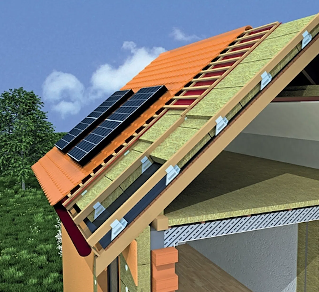 K tomuto účelu se nejlépe hodí pružné desky z kamenné vlny s nízkou hustotou a narušenou strukturou vláken. Taková izolace se snadno vejde mezi dřevěné prvky konstrukce a vyplňuje dutiny účinněji než tuhé pěnové desky. Za optimální, ekonomicky odůvodněnou tloušťku izolace pro podkroví se považuje 30 cm ve dvou vrstvách. Použitím desek s nízkou tepelnou vodivostí λD = 0,034 W/mK, jako je PAROC UNS 34, lze ušetřit na tloušťce izolace.