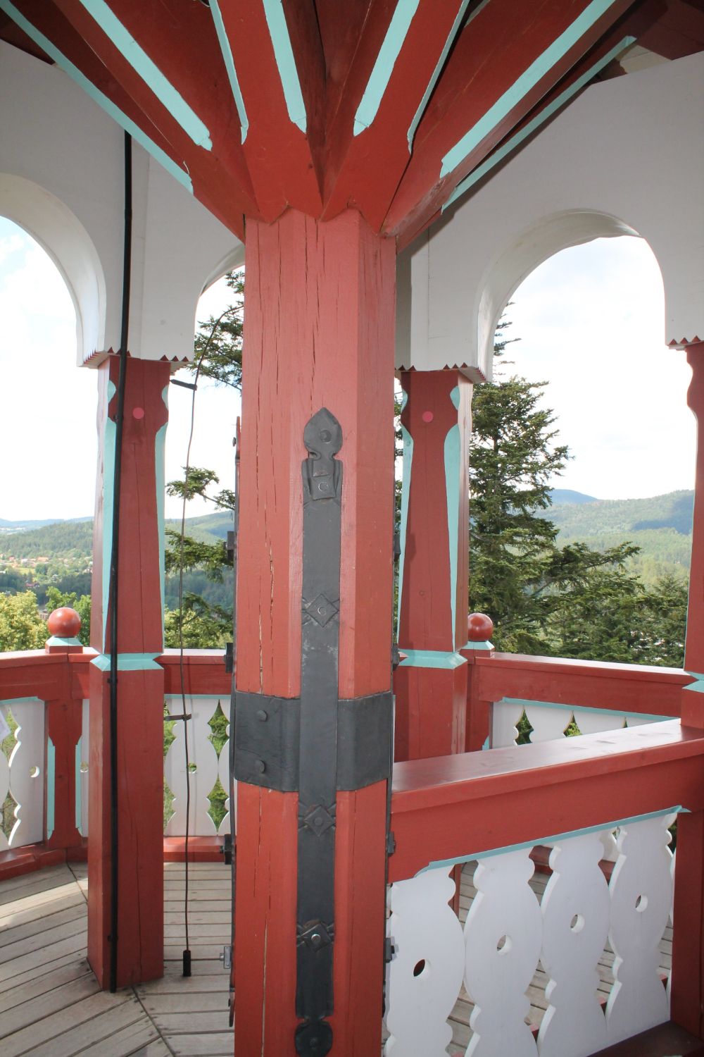Barevnost, to byl další oříšek, který bylo nutno u Jurkovičovy rozhledny rozlousknout. Na zabudovanou kulatinu stačilo karbolineum extra v tmavé barvě. Všechno ostatní řezivo je barvené, pod barvou je dřevo impregnováno dvojnásobným nátěrem Bochemitem Plus bezbarvým. V nejnamáhanějších spojích je použit Bochemit téměř neředěný, aby zajistil dlouhodobou ochranu dřeva. Řešit samotnou barevnost ale nešlo jinak než s pomocí dobových originálů barev. Jenže v roce 1896 přesné odstíny nebyly, stupnice RAL neexistovala – barva byla taková, jakou se ji zrovna podařilo namíchat. Do toho se stavitelé rozhledny museli trefit. Pomohlo jim, že Jurkovič má své charakteristické barvy, jejichž přesné odstíny byly uchovány na fragmentech na Pustevnách. Jurkovičovou charakteristickou barvou je výrazně červenohnědá, matná s jemně zrnitou povrchovou strukturou. Její přesné kopie dnes nejsme schopni dosáhnout.