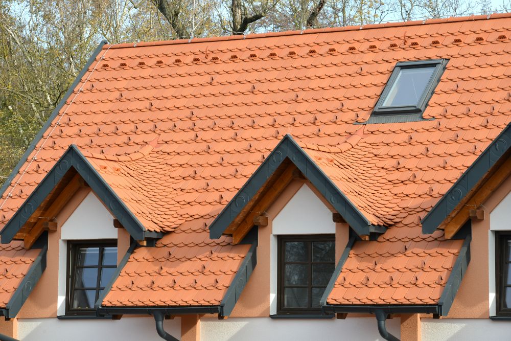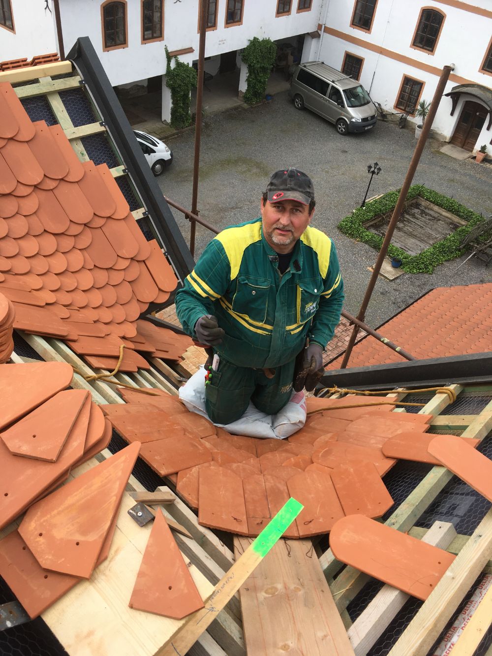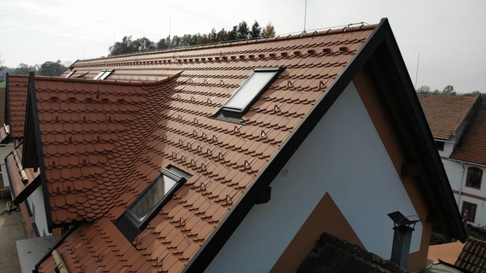 Další zajímavostí je 50 bm vykládaných úžlabí. Na malých vikýřích je úžlabí provedeno rovnoboké, na velkých vikýřích je nerovnoboké, jedno v délce pět metrů. Celkem je na střeše 20 bm nerovnobokých úžlabí.