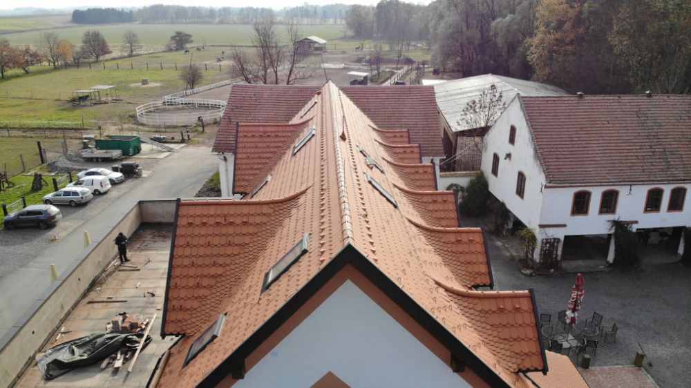 Rozsah prací na penzionu byl sice větší, ale stavbu vám představujeme především kvůli realizovaným „vychytávkám“. Situování na polosamotě a taky chov koní stojí za tím, že se v místě běžně vyskytují kuny. A to do té míry, že s nimi investor získal nedobré zkušenosti. Proto jsou v nové střeše provedena „protiopatření“. V celé ploše pod krytinou je zabudováno pletivo proti kuně.