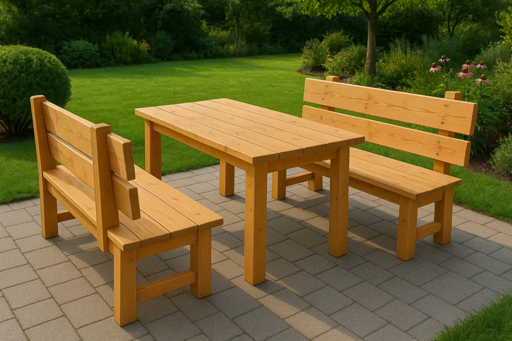 Set (stůl + 2 lavice) je vyrobený z KVH hranolů a ošetřený kvalitním bezbarvým lakem.