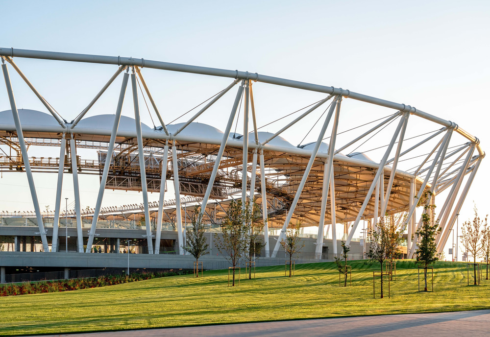 Unikátní kabelová síť zajišťuje, že střecha odolá nejrůznějším zatížením při zachování plné funkčnosti. Pod statickým řešením střešní konstrukce jsou podepsány firmy EXON 2000, bim. GROUP a Buro Happold.