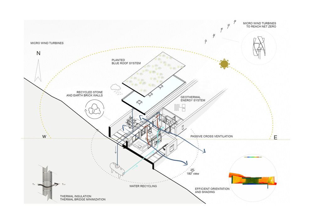 Rezidence na strmém svahu s výhledem na Egejské moře má rozlohu 230 m2 a je částečně zapuštěná do země. Tím je definovaná jak forma stavby, tak její energetické nároky. Kámen vytěžený při budování je zpětně použitý jak pro stavbu stěn, tak pro obklady. Materiálová vazba domu na místo je díky tomu velmi silná. Kromě toho projekt pracuje s recyklovaným dřevem, pohledovým betonem a původní vegetací. Tento mix stavbě zajišťuje nízkou uhlíkovou stopu.
