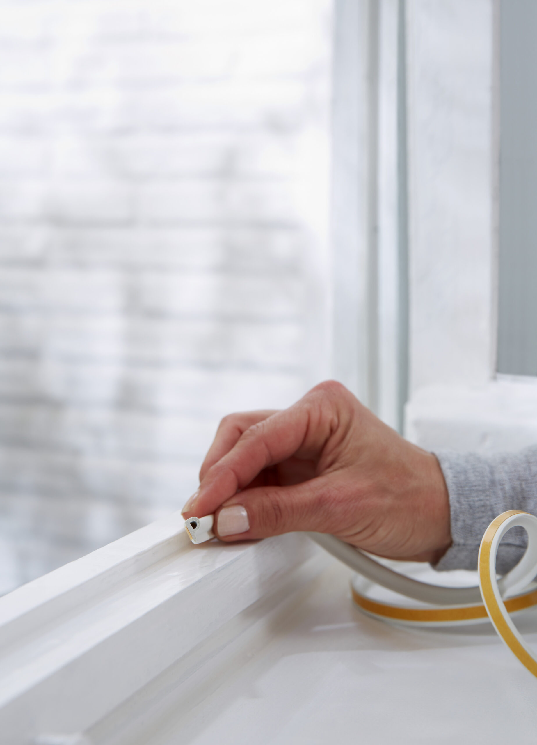 Odlepte několik centimetrů ochranného proužku a přimáčkněte těsnící profil k podkladu. Postupně odstraňujte ochranný papír a současně přitlačujte těsnění k rámu okna. Postup je shora dolů a stále je nutno se vyvarovat napínání těsnění. U kyvného okna se těsnění nahoře lepí na samotné okno, v dolní části na rám okna. Nakonec dohlédněte na těsnost v rozích a v oblasti kolem pantů.