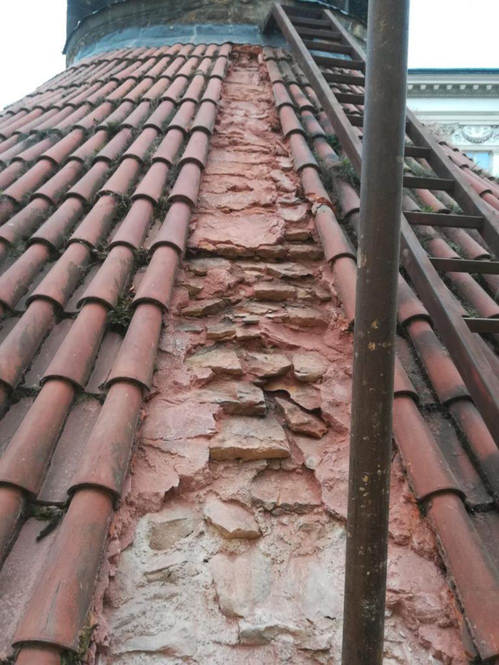 Po odstranění původní krytiny čekalo na stavaře překvapení. Zjistili, že v minulosti se vždy měnila pouze samotná krytina, kdežto podkladní maltové lože se jen přivrstvovalo. Krytina kvůli tomu už neležela na římse, ale byla výše. Realizační firma A-Z Bau se rozhodla udělat rekonstrukci pořádně, proto odstranili staré vrstvy až na podklad.