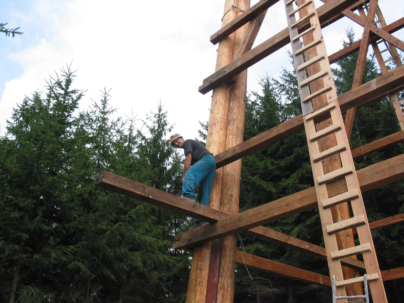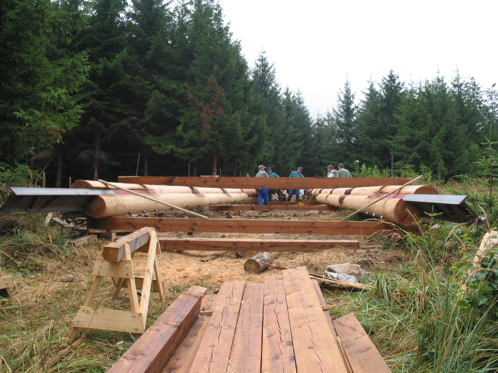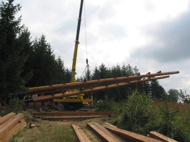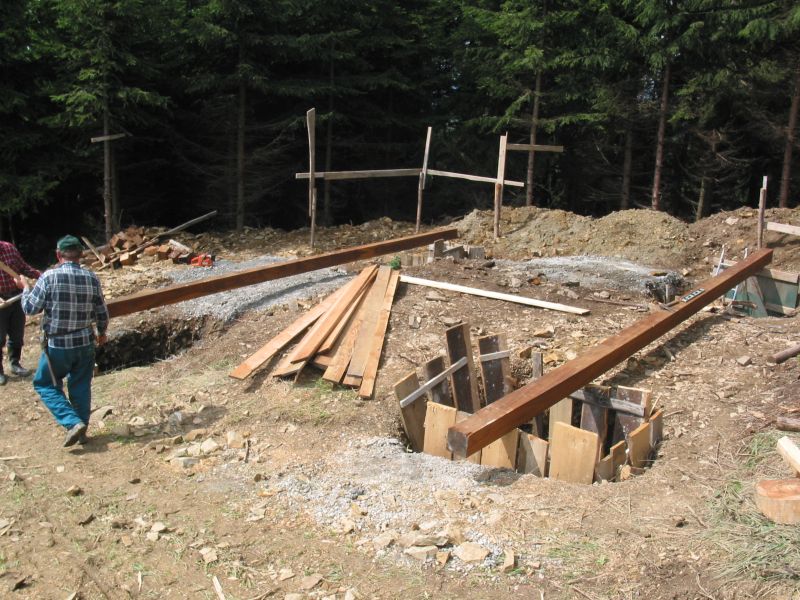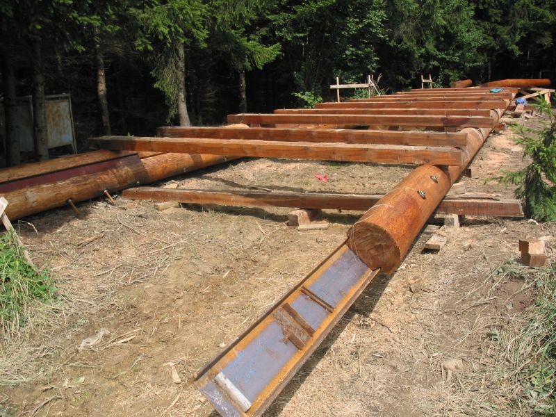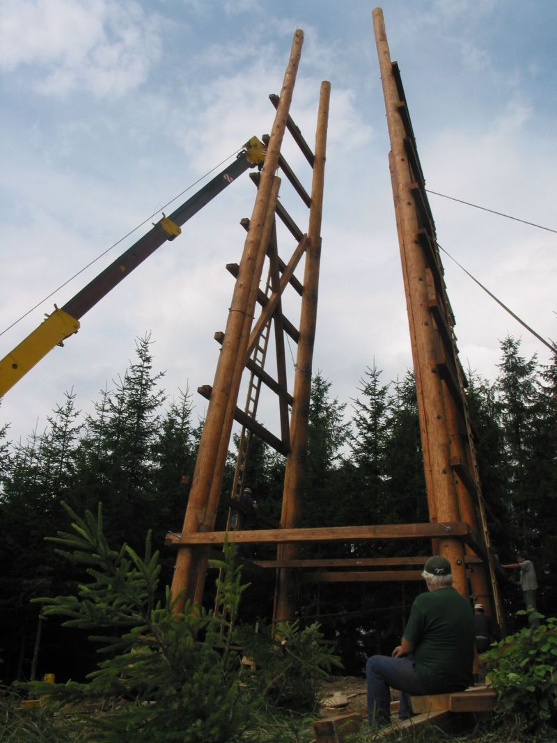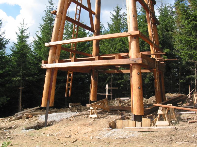 Klády přivezli jedinou lesní přístupovou cestou na malý palouk a zbytek stavby probíhal přímo na místě. Tesaři se tak museli spolehnout převážně na ruční práci a ruční nářadí. K dispozici sice měli agregát, ale ten jim sloužil jen na nejsložitější části konstrukce. V roce 2006 si totiž o aku nářadí mohli ještě nechat jen zdát.
