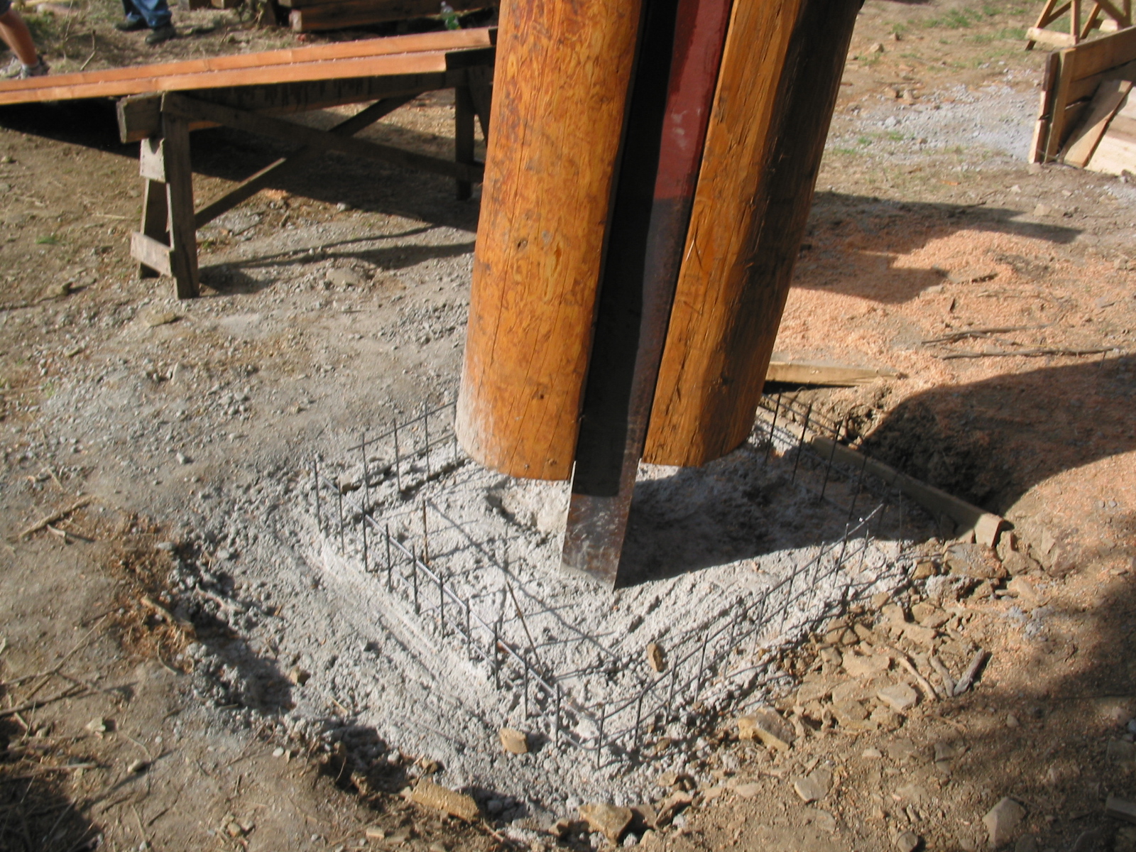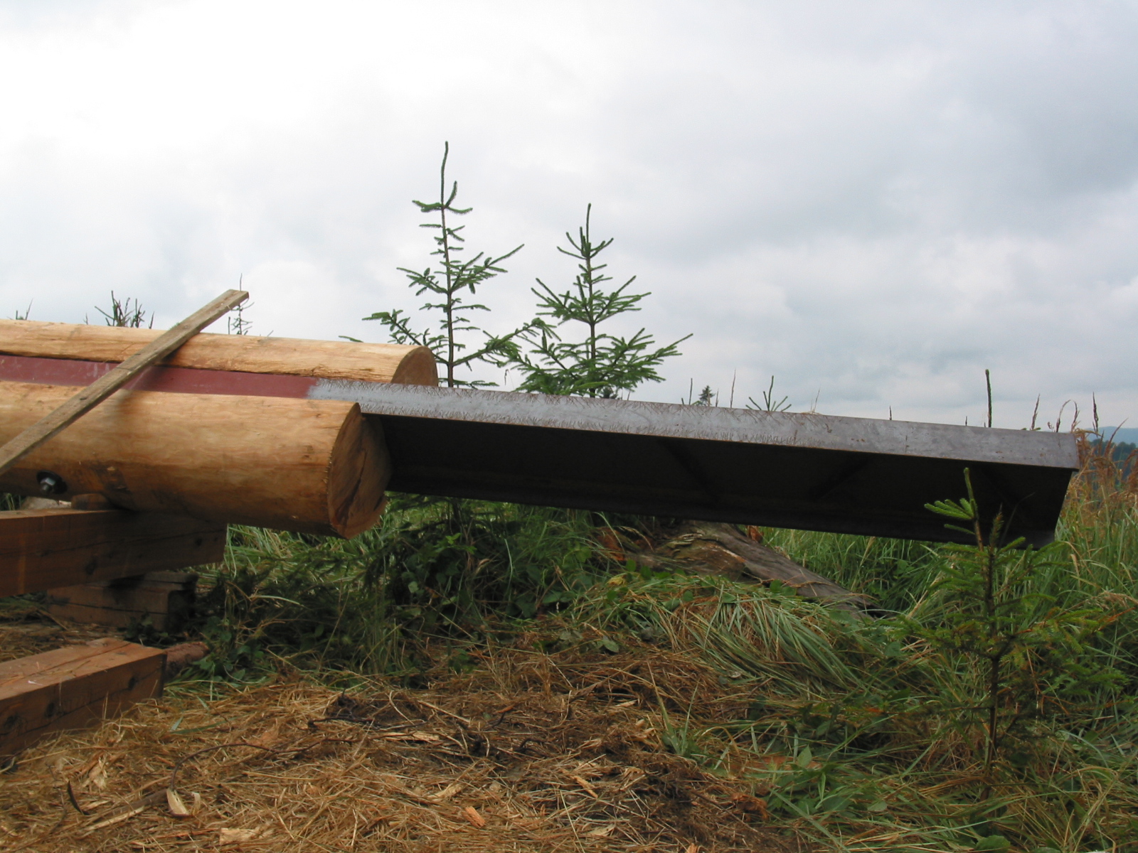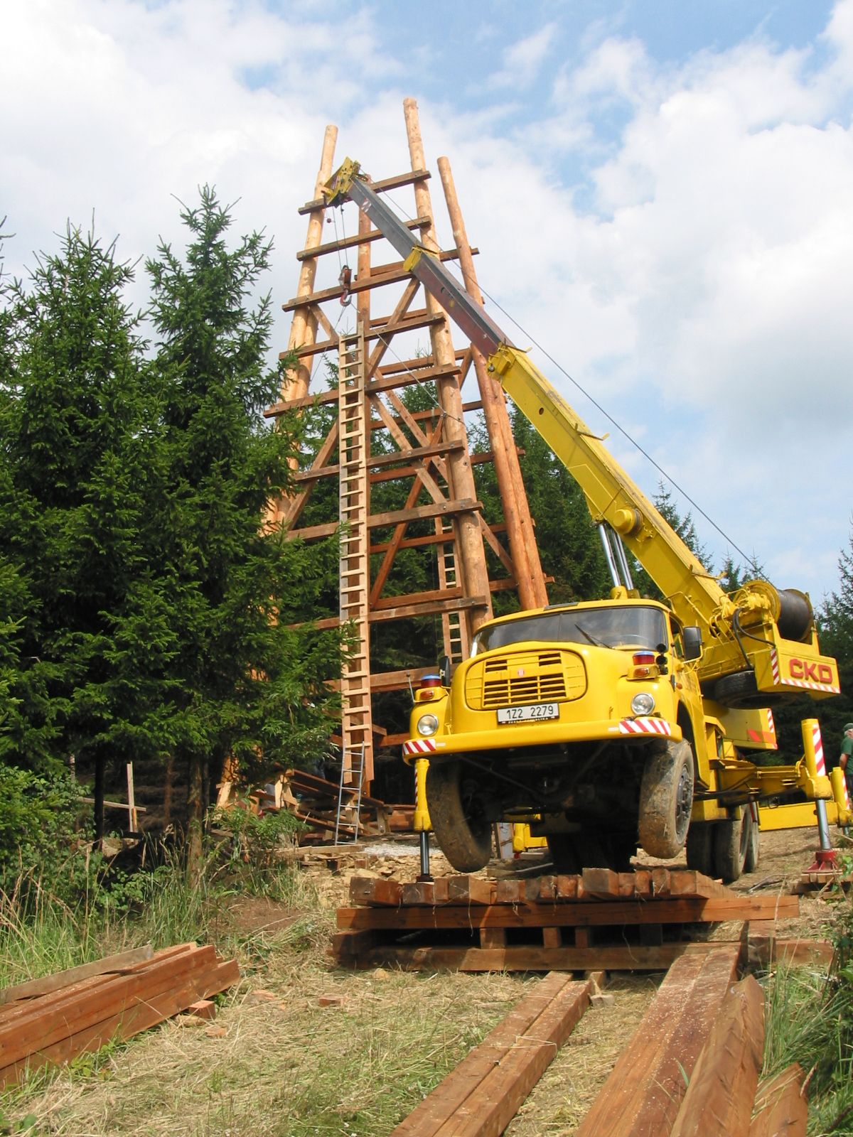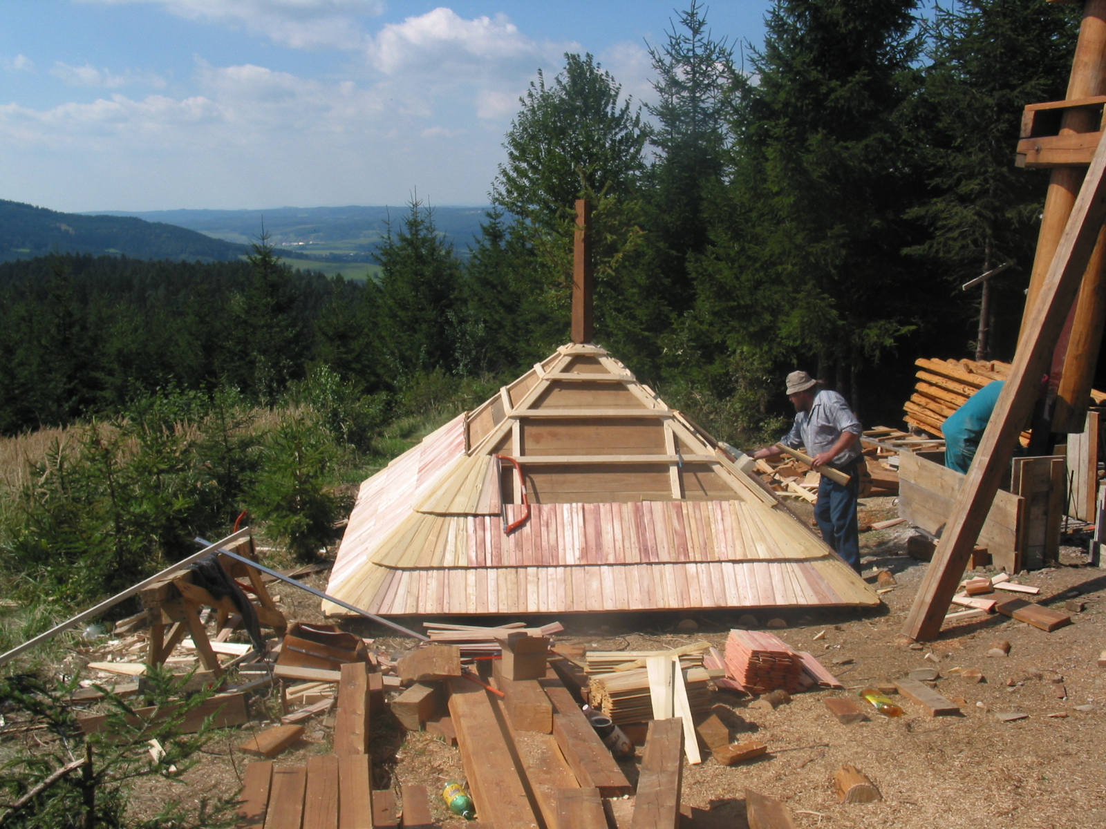 Klády přivezli jedinou lesní přístupovou cestou na malý palouk a zbytek stavby probíhal přímo na místě. Tesaři se tak museli spolehnout převážně na ruční práci a ruční nářadí. K dispozici sice měli agregát, ale ten jim sloužil jen na nejsložitější části konstrukce. V roce 2006 si totiž o aku nářadí mohli ještě nechat jen zdát.