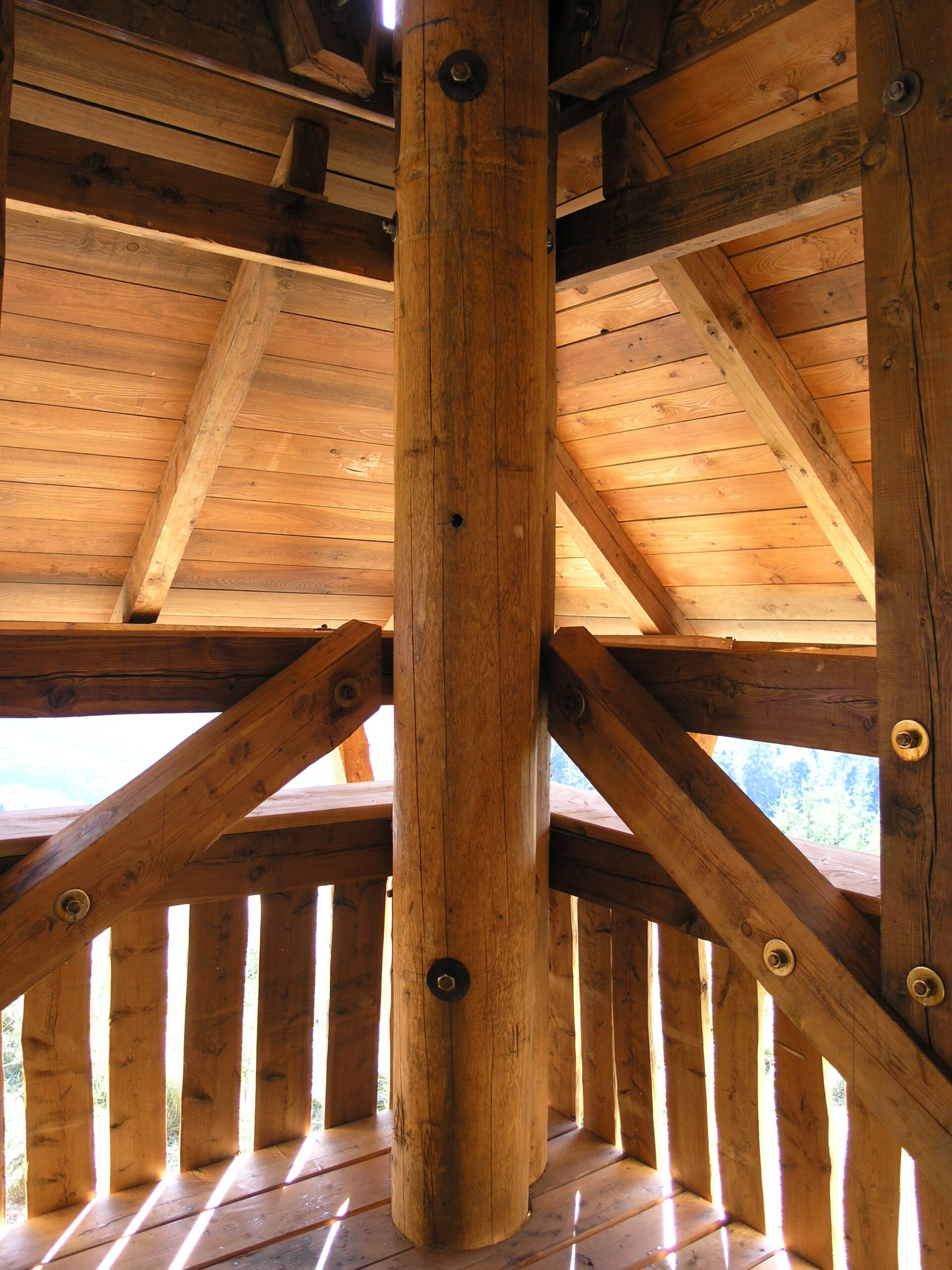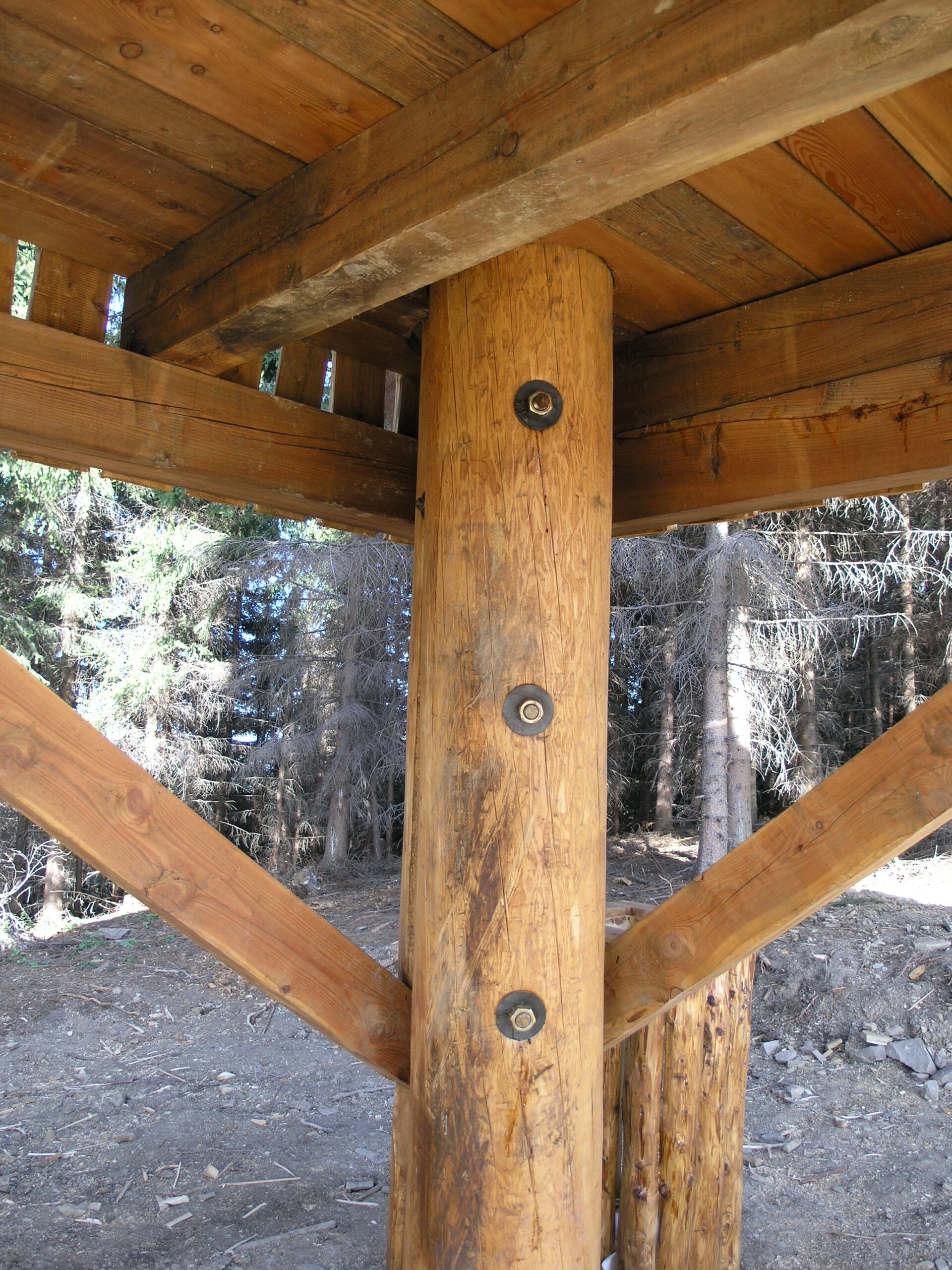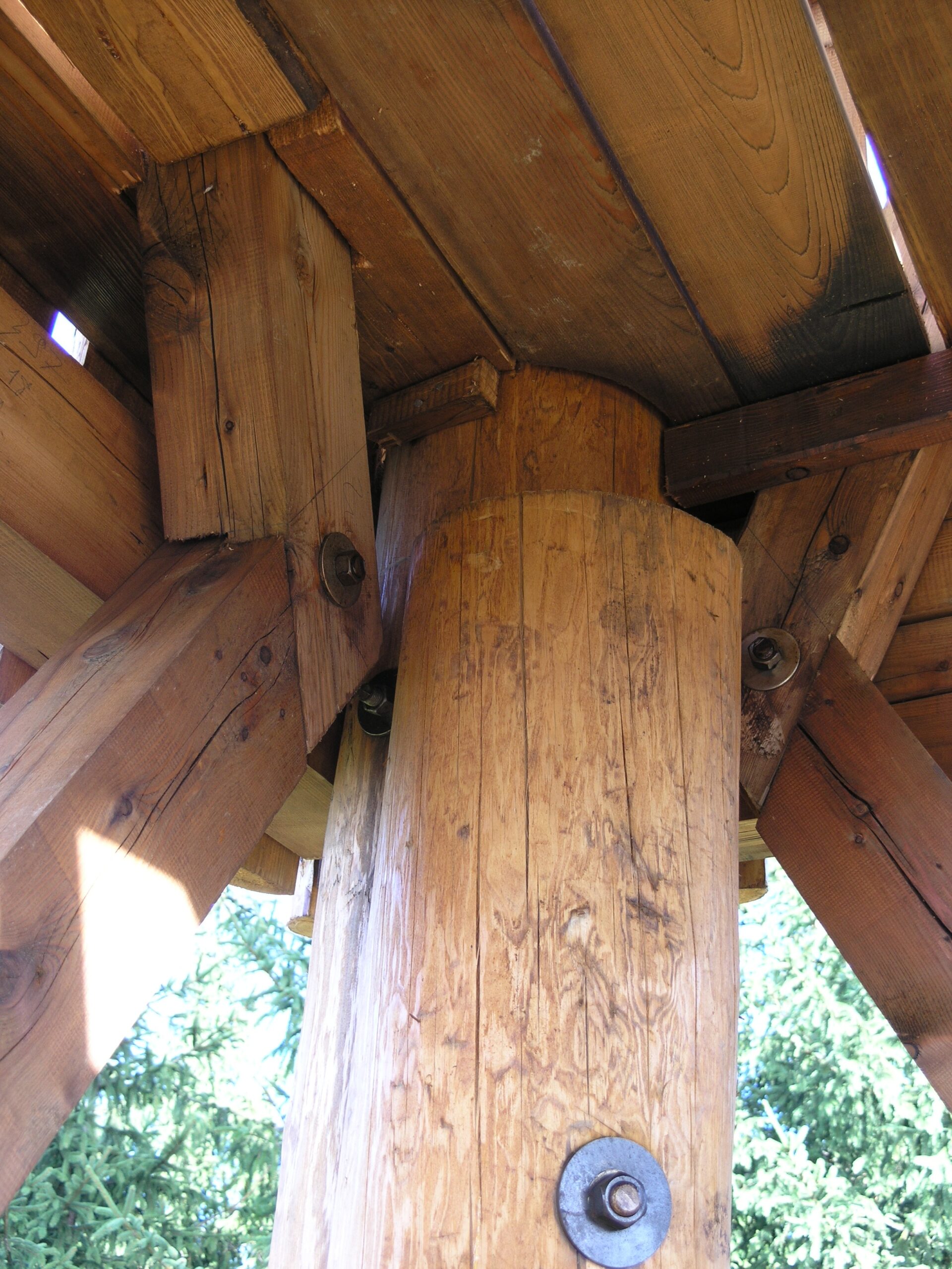 Použité dřevo je modřín. Pro nosné sloupy si tesaři dřevo vybírali sami přímo v lese, muselo totiž vyhovovat náročným podmínkám na kvalitu, křivost a tvar. Impregnovali ho nátěrem Bochemit, který fixovali ještě Karbolinem Extra.