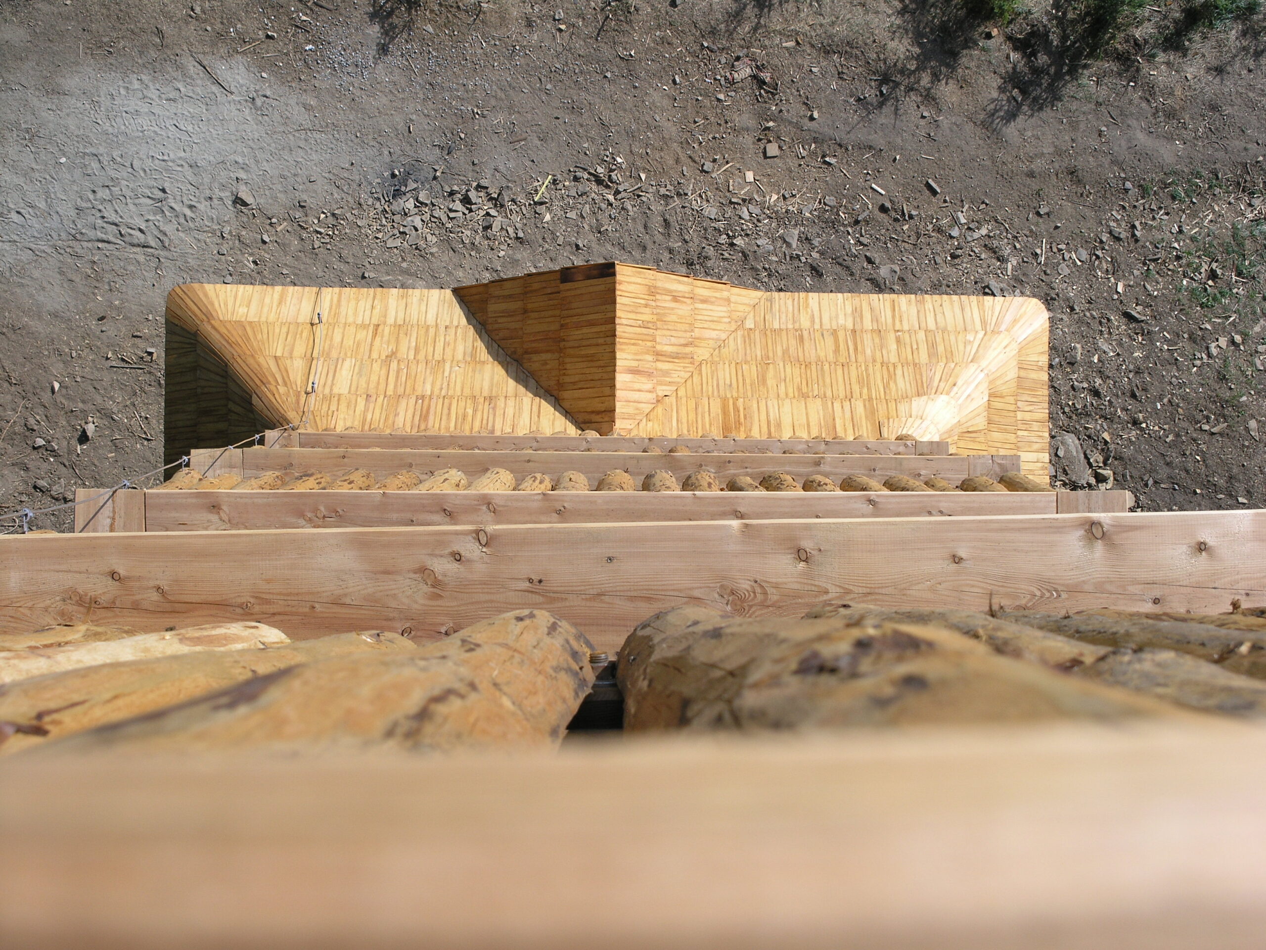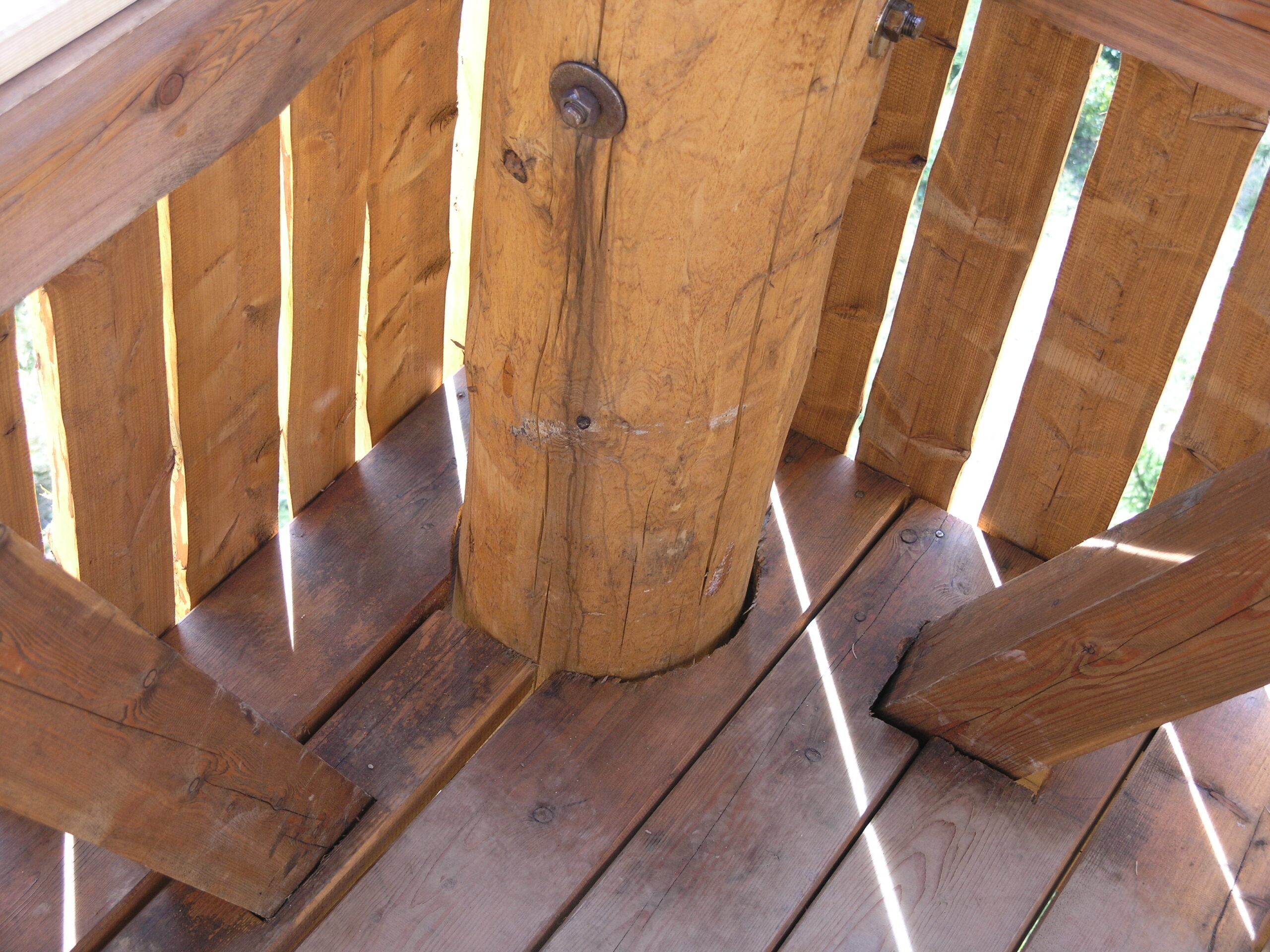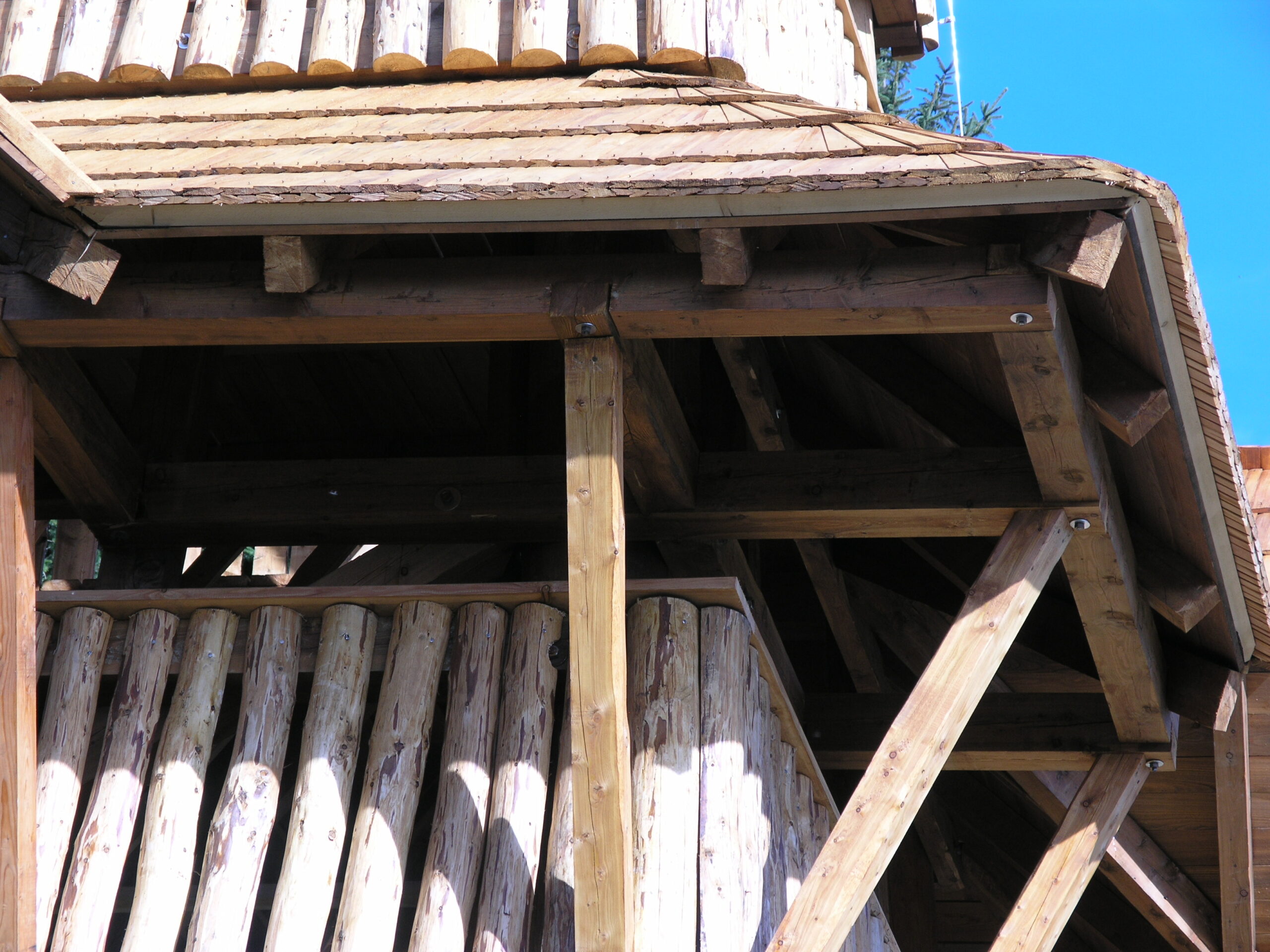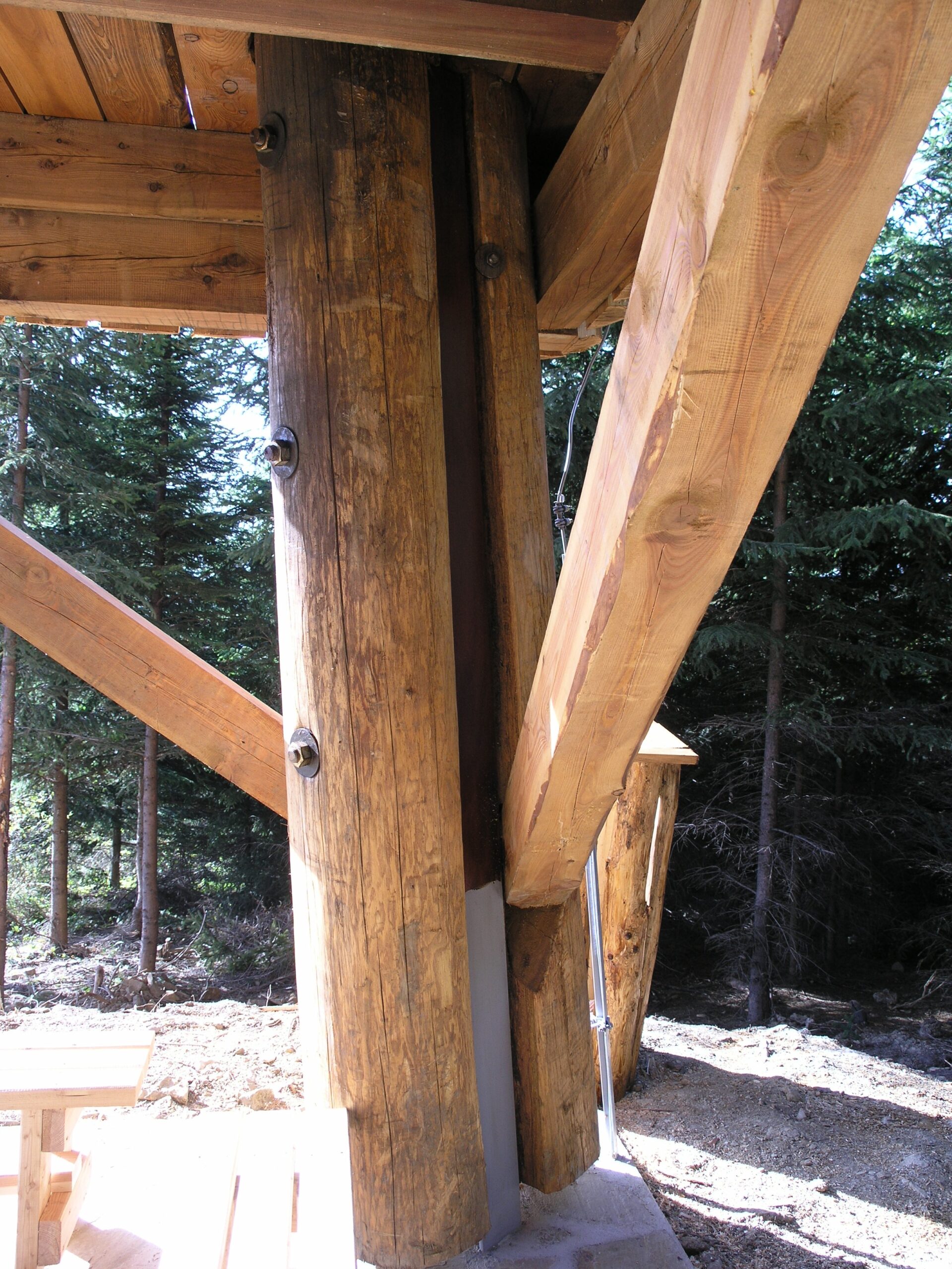 Použité dřevo je modřín. Pro nosné sloupy si tesaři dřevo vybírali sami přímo v lese, muselo totiž vyhovovat náročným podmínkám na kvalitu, křivost a tvar. Impregnovali ho nátěrem Bochemit, který fixovali ještě Karbolinem Extra.