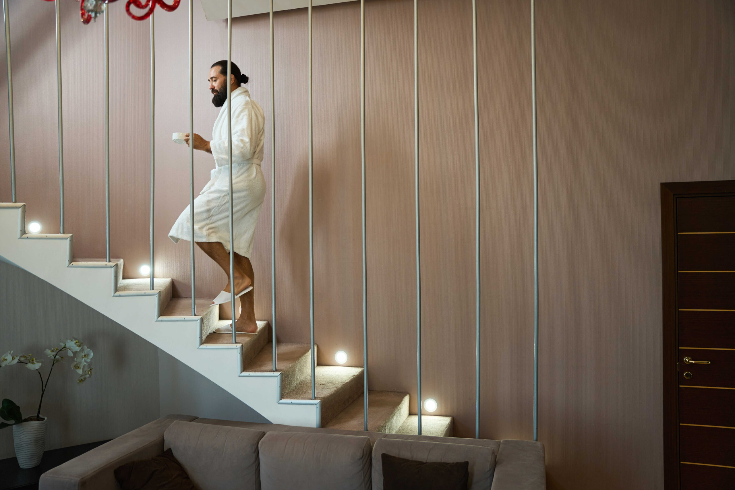 Pro pohodlné a bezpečné používání schodiště nezapomeňte na správné osvětlení. Dobře umístěné osvětlení nejen zvyšuje bezpečnost, ale také vytváří atmosféru. Moderní LED pásky podél schodů nebo zabudovaná bodová světla mohou prostor elegantně podsvítit a zároveň ušetří energii.