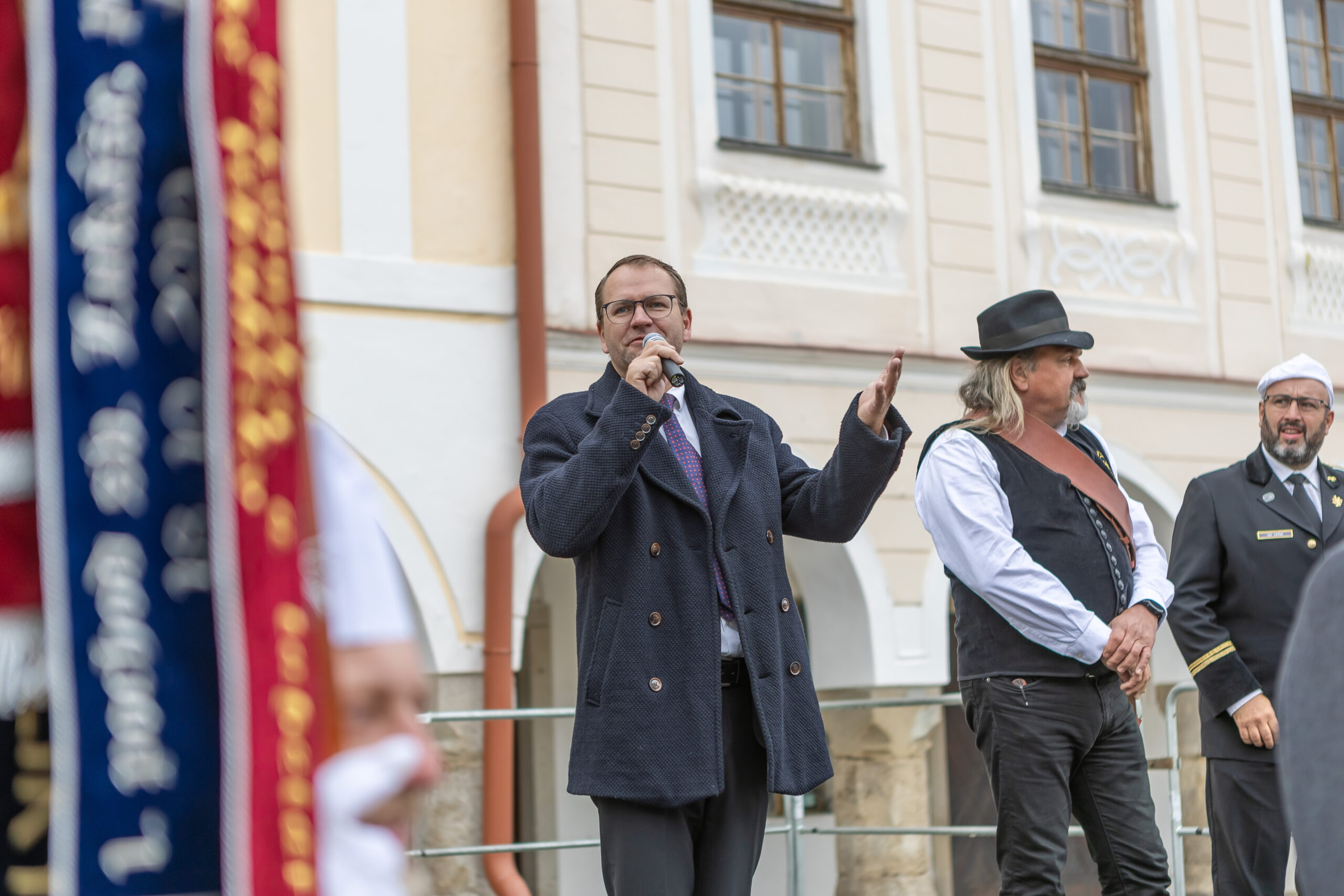 Na průvod už na náměstí čekal starosta Telče, Mgr. Vladimír Brtník. Vyjádřil velikou radost nad tím, že si cechy pro své setkání vybraly právě Telč. Jako symbolické viděl propojení starobylé Telče s řemeslníky, jejichž předkové vybudovali veškerou krásu tohoto města. Vyjádřil jim svou vděčnost za to, že se starají o svá řemesla a předávají je mladé generaci. Své vystoupení ukončil nadějí, že se s řemeslníky v Telči nesetkává naposled.