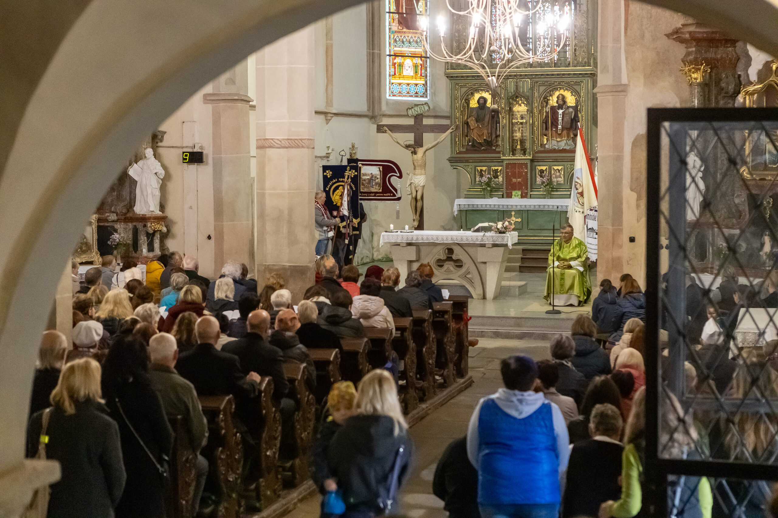 Všichni se pak společně zúčastnili slavnostní bohoslužby, během které stáli vlajkonoši s cechovními zástavami na čestném místě po stranách oltáře. Děkan Mgr. P. Josef Maincl během své řeči ocenil, že každý cech má svého patrona. S Cechem klempířů, pokrývačů a tesařů je spojená svatá Barbora, jako ochránkyně před rizikem náhlé či násilné smrti. Pracovníky na střechách chrání, aby nespadli. Pan děkan se pomodlil za její přímluvu, aby členům cechu byla svatá Barbora nablízku a oni cítili, že jdou pod jejím praporem. Ten potom přímo požehnal slovy:
