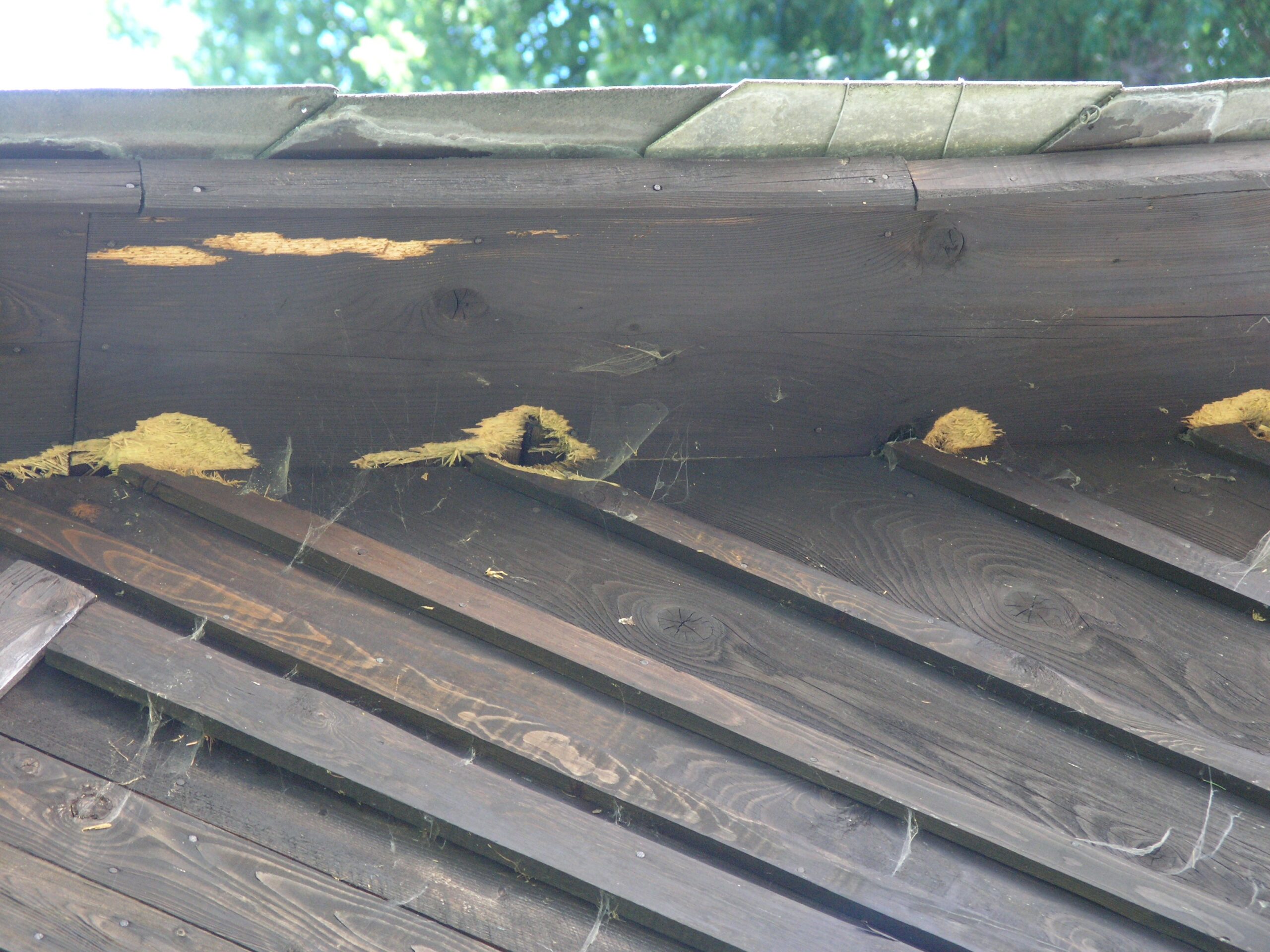 Do té doby sem tam nějaké prkno proklepal, ale vždy dal nakonec přednost hledání obživy někde v přírodě. Pak ale musel objevit ve štítu něco zvlášť přitažlivého, a od té doby se tam stále vrací. Podbití přesahu štítu už je jak cedník, a taky každá lišta ve štítu je na konci „ozdobena“ uměleckým vyhloubením od jeho zobáku.