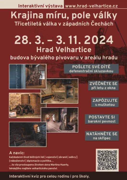 Martin Huerta byl nižší šlechtic a vojenský dobrodruh, který v rámci třicetileté války a vojenských služeb dostal velhartické panství. A tak zde nechal vybudovat zámek na horním nádvoří. Na výstavě si prohlédnete nejen zámek, ale dozvíte se také o politické situaci té doby, jak fungoval každodenní život a v neposlední řadě také i o vojenství a technice tehdejšího válčení.